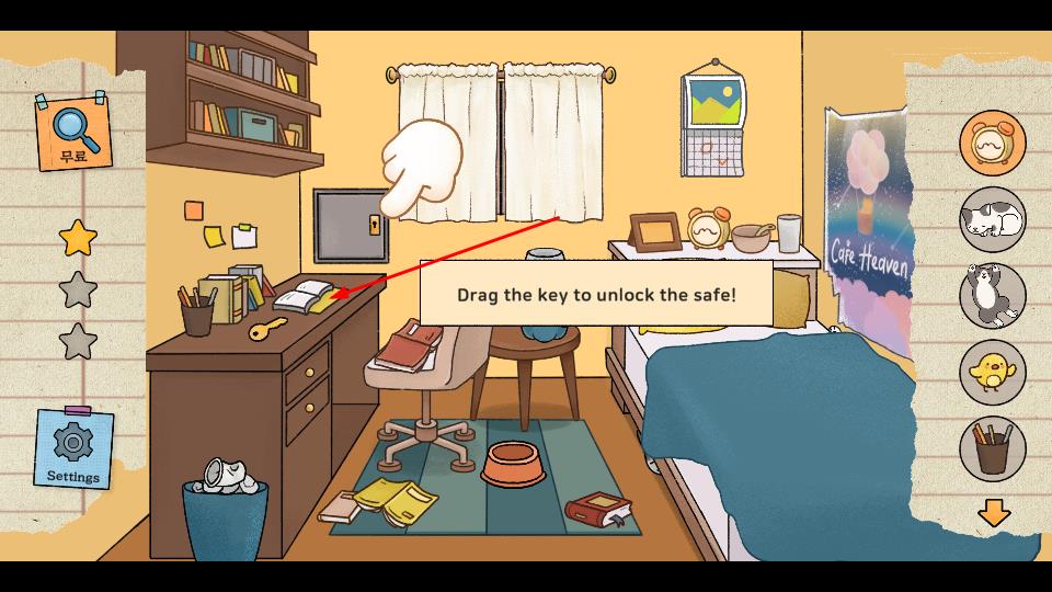 2、在房间场景点击右侧图标切换道具,探索各处,找到隐藏角色,拖动钥匙解锁保险箱等推进解谜。