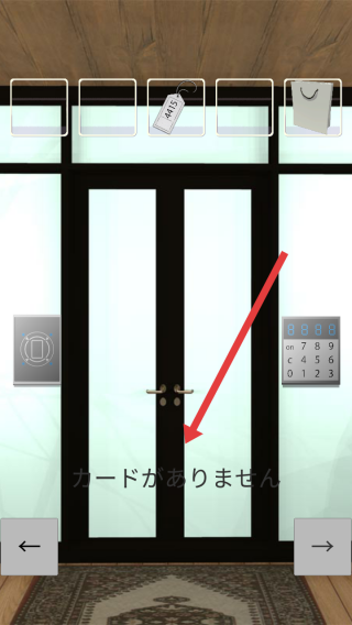 2、操控场景到大门前,可以看到カードがありません的提示,需先获取上方标有4415的标签,作为解谜线索。
