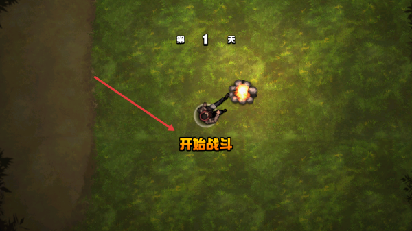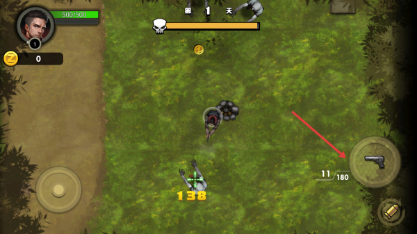 1、点击开始战斗进入第1天场景,按住摇杆移动角色熟悉操作,留意敌人僵尸出现方向。