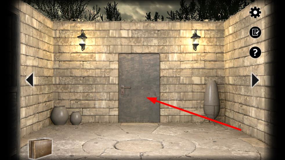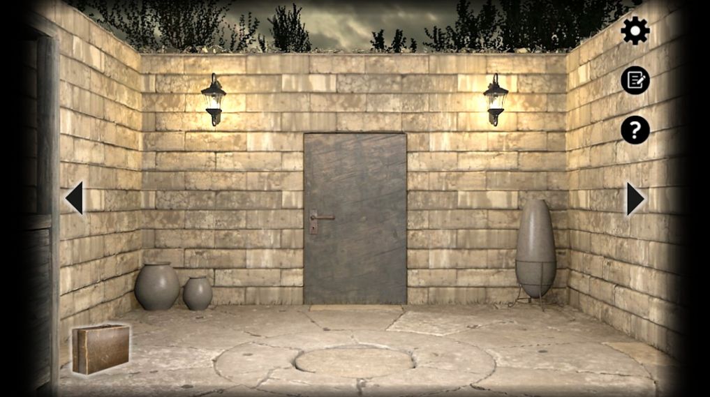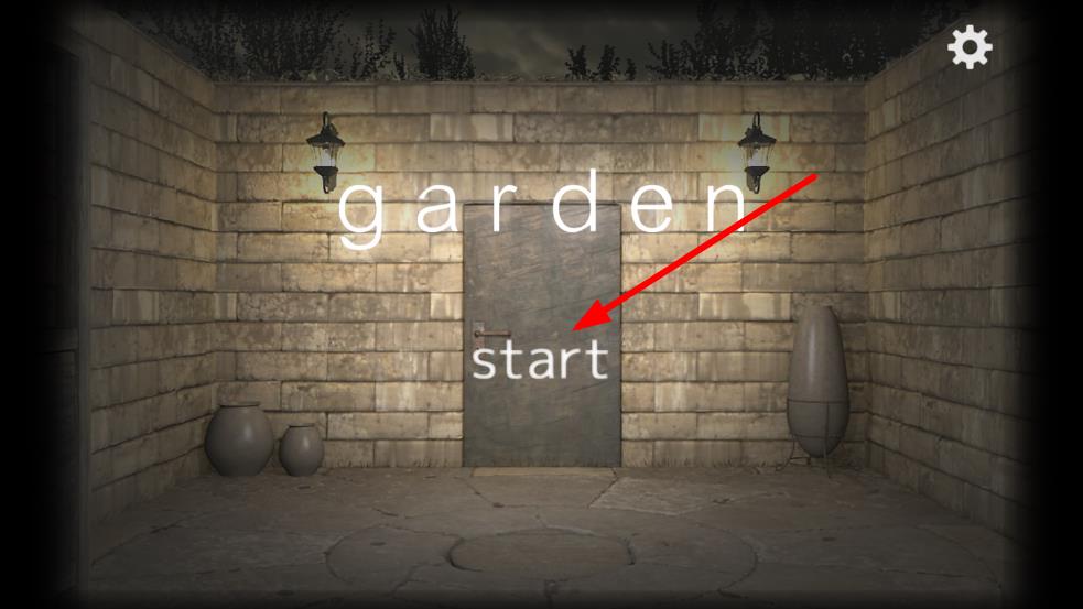1、点击“开始”进入花园初始场景,观察石墙、陶罐、铁门等环境元素,收集地面木箱等物品,尝试点击铁门、花盆等开启探索第一步。