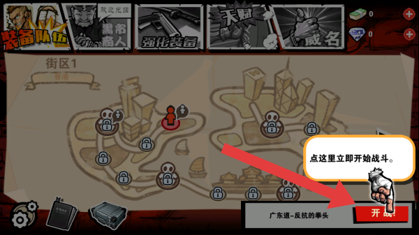 2、地图区域处于街区1,根据战斗提示点这里立即开始战斗,战斗关卡广东道-反抗的拳头,点击开始的按钮。