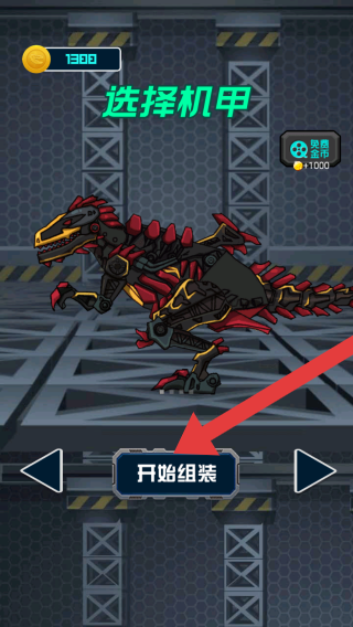 1、显示金币数量1300、功能标题选择机甲、建造机甲按钮及所需金币1000、点击核心操作按钮开始组装。