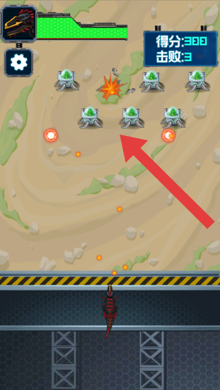 3、得分300、击败了敌人数量3,呈现了战斗的游戏场景,左上角有载具或技能显示、设置齿轮按钮。