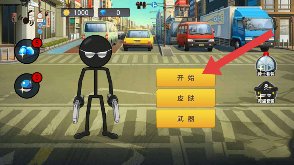 1、呈现城市街道场景,有火柴人角色持双枪、戴墨镜,点击开始的功能按钮,属于火柴人射击或冒险类的主界面。