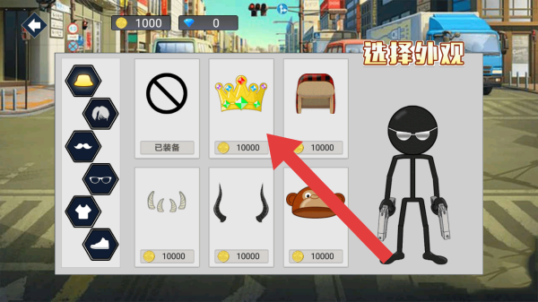 2、画面中显示火柴人角色持枪形象,点击选择外观的界面可选择皇冠等多种外观装饰选项,部分装饰标有价格为10000金币。