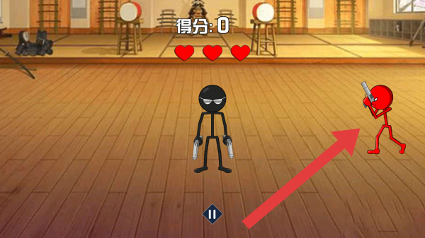 3、呈现两个火柴人角色在室内道场场景对战,目前界面显示得分0,属于火柴人动作对战的战斗场景。