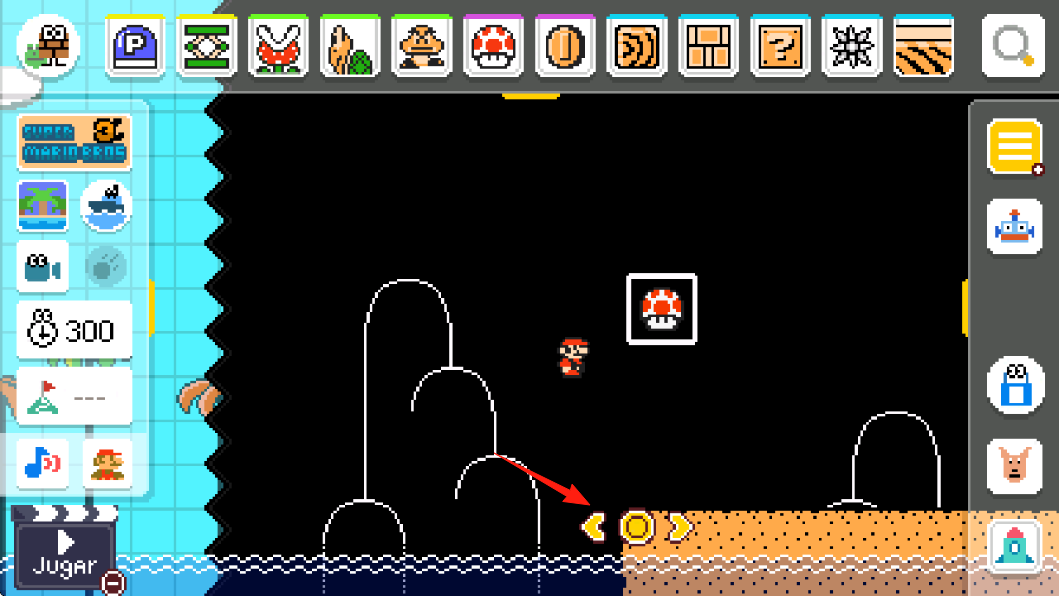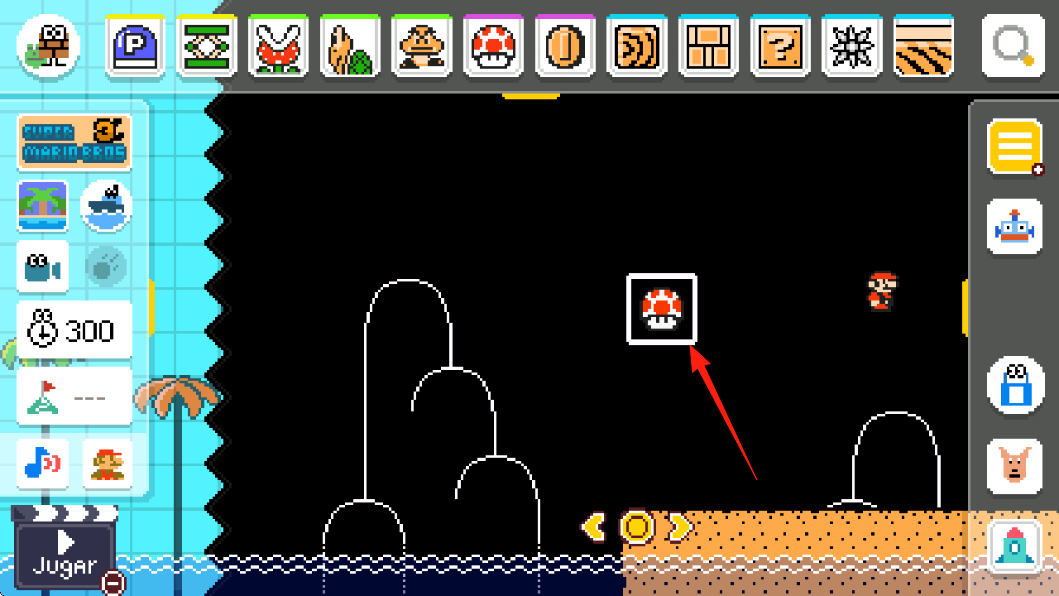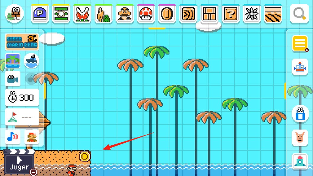 1、点击左下角Jugar开始,进入箭头指向的沙滩场景关卡,操控马里奥开始冒险。