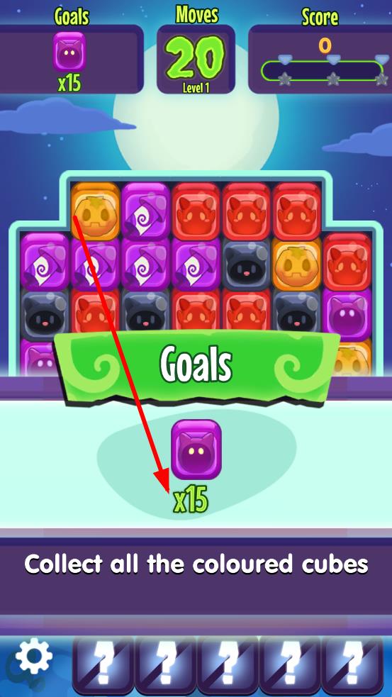 1、首关界面见“Collect all the coloured cubes”提示,按目标要求,如收集15个紫色方块,连接相同方块开始消除,熟悉基础操作开启闯关。