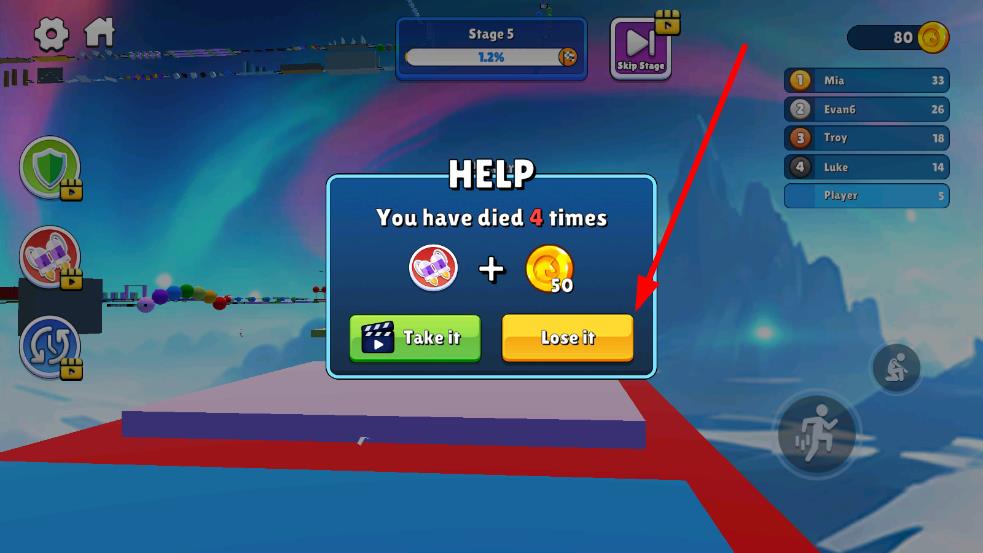 3、若角色碰撞障碍死亡,弹出“HELP”提示框,可选“Take it”观看广告复活或“Lose it”重新开始,成功通过当前关卡进度条。
