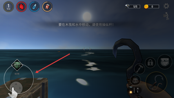 1、点击生存模式玩进入游戏操控木筏用左侧操纵杆移动熟悉方向控制留意上方生命饥渴等状态。