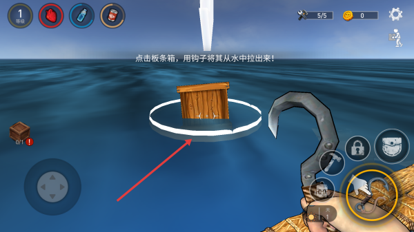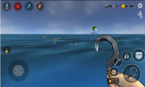 2、遇海上板条箱按提示用钩子点击拉动获取物资如工具资源优先补充水和食物维持生存。