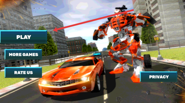1、在游戏的主页面,点击蓝色PLAY按钮,进入游戏主界面,开启变形金刚主题的驾驶战斗之旅。