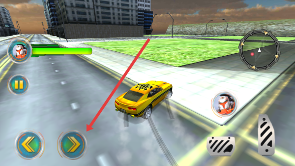 3、在游戏中驾驶黄色汽车在道路行驶,通过使用右侧方向按钮操控转向,完成关卡任务。