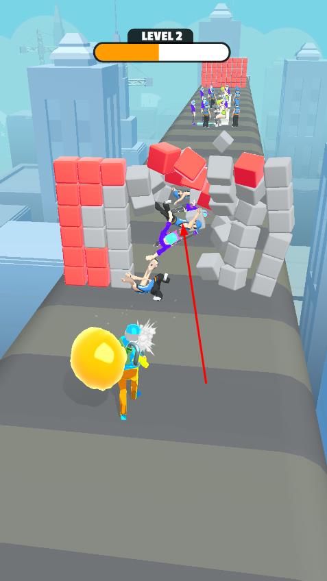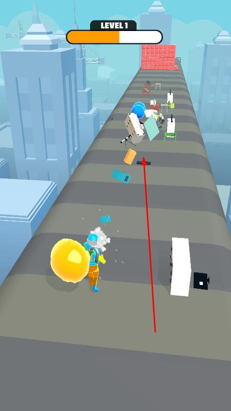 2、收集物品壮大吸附球,用其撞击障碍物红色砖墙,击飞敌人,推进关卡。