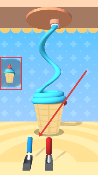 2、点击按钮挤出蓝色奶油到蛋筒后,观察左侧示例图,选择对应颜色配料冰淇淋如红色进行装饰。