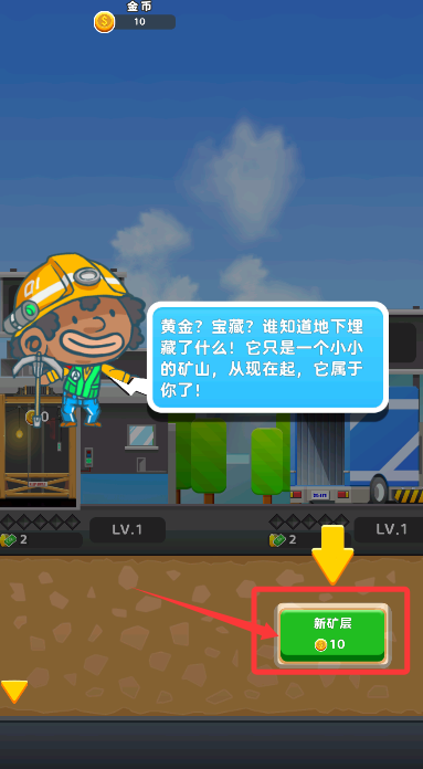 1、游戏开始后,点击“新矿层”选项,消耗10枚金币即可解锁新的开采区域。