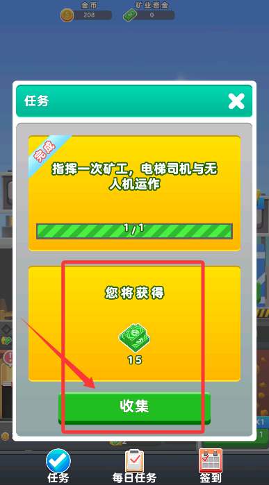 4、达成目标后,前往任务中心点击领取,获得15资金采矿专用资金。