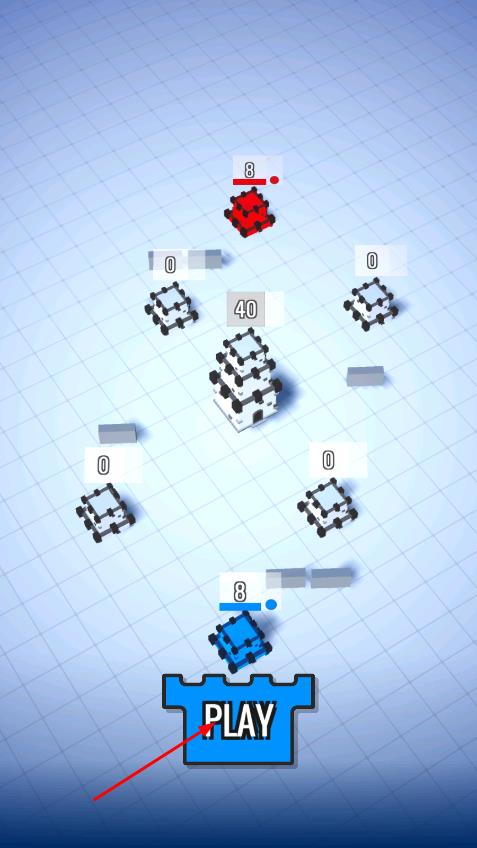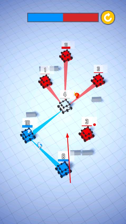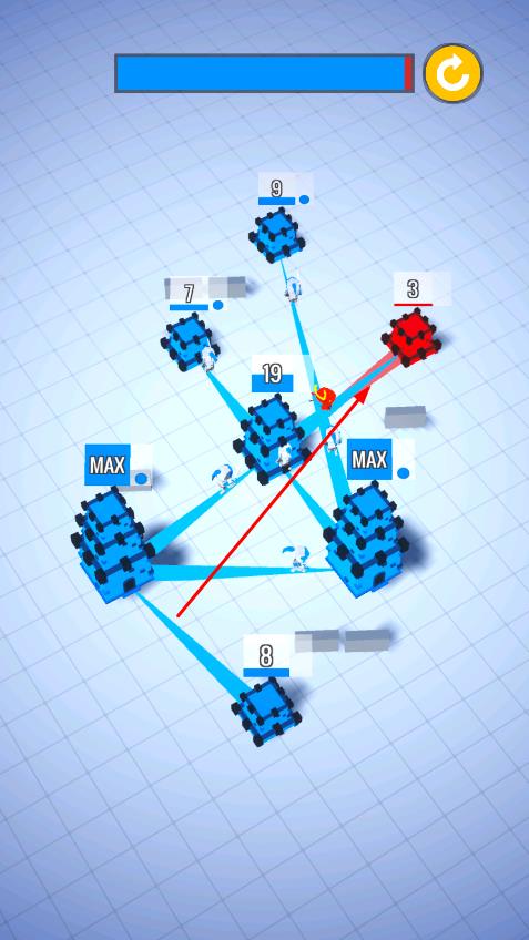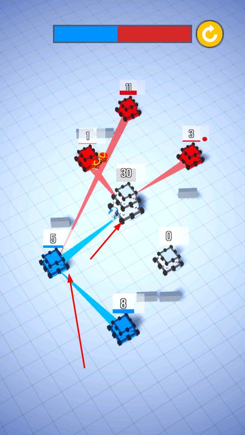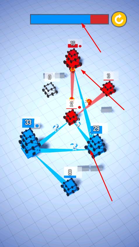1、布置红蓝双方方块建筑,带数字兵力,蓝色建筑出兵,蓝线连接 ,进攻红色建筑。