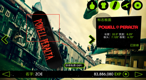4、授权装备系统收录Powell&Peralta等知名品牌真实产品,数十种板面、轮轴组合影响滑行手感和特技表现。