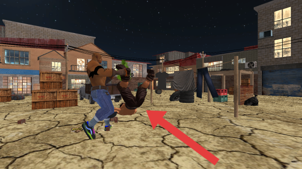 3、呈现两个角色在户外场景荒地、有建筑物对战,一个角色将另一个角色举起,红色箭头指向被举起的角色。