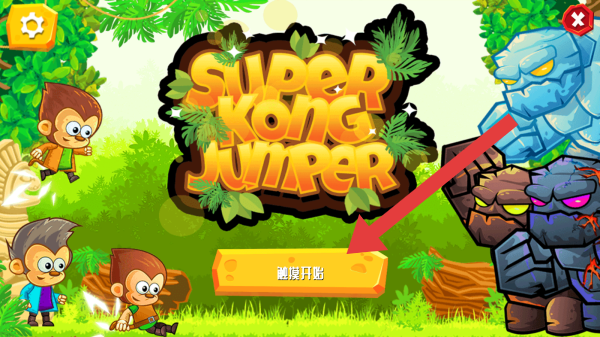 1、界面有难度开始按钮,点击方可进入,还有猴子角色、怪物角色,左上角是设置齿轮图标,右上角是关闭按钮。