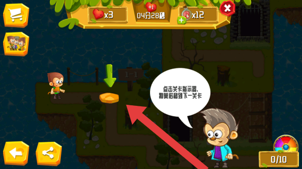 2、点击关卡触发器,探索路径到下一关卡,还有关卡标识1-1、箭头指引、猴子角色及0/10进度显示。