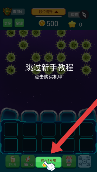 1、玩家当前段位为青铜4,有500金币,界面提示可跳过新手教程和点击购买机甲,下方操作按钮有回收、HH×2、购买1号地、自动合成等。