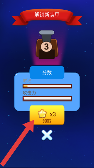 3、解锁的是3号装甲,显示了射速、攻击力分数条,可点击领取×3按钮获取奖励,属于养成或升级环节提示。