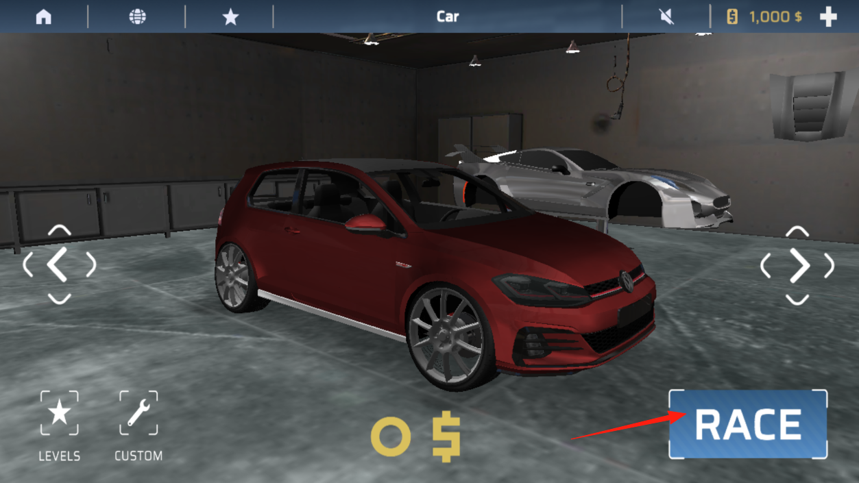 1、进入车库界面,看到红色赛车与RACE按钮,点击RACE,进入赛事选择,可参与竞速挑战,从车库场景切换到赛事模式,为驾驶赛车在赛道比拼做准备。