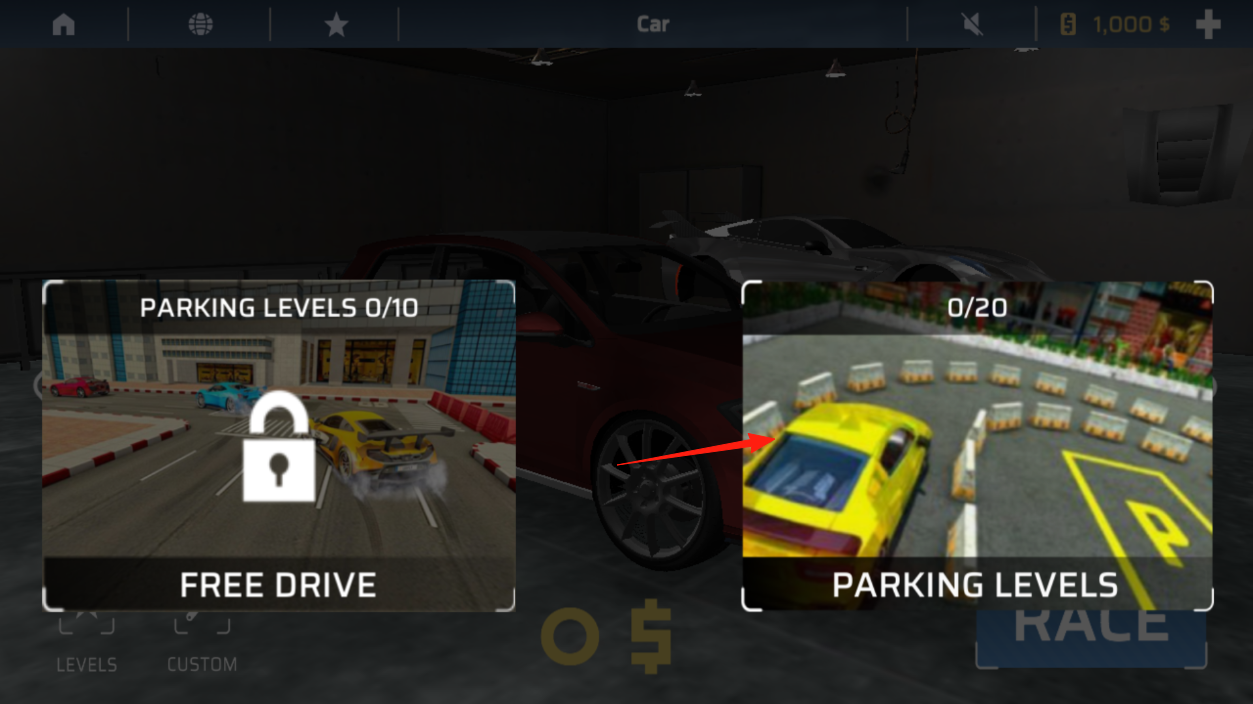 2、在赛事选择页,有FREE DRIVE和PARKING LEVELS等模式,点击PARKING LEVELS,进入停车挑战,操控赛车完成停车任务,切换到停车玩法,在停车场景中锻炼驾驶技巧。