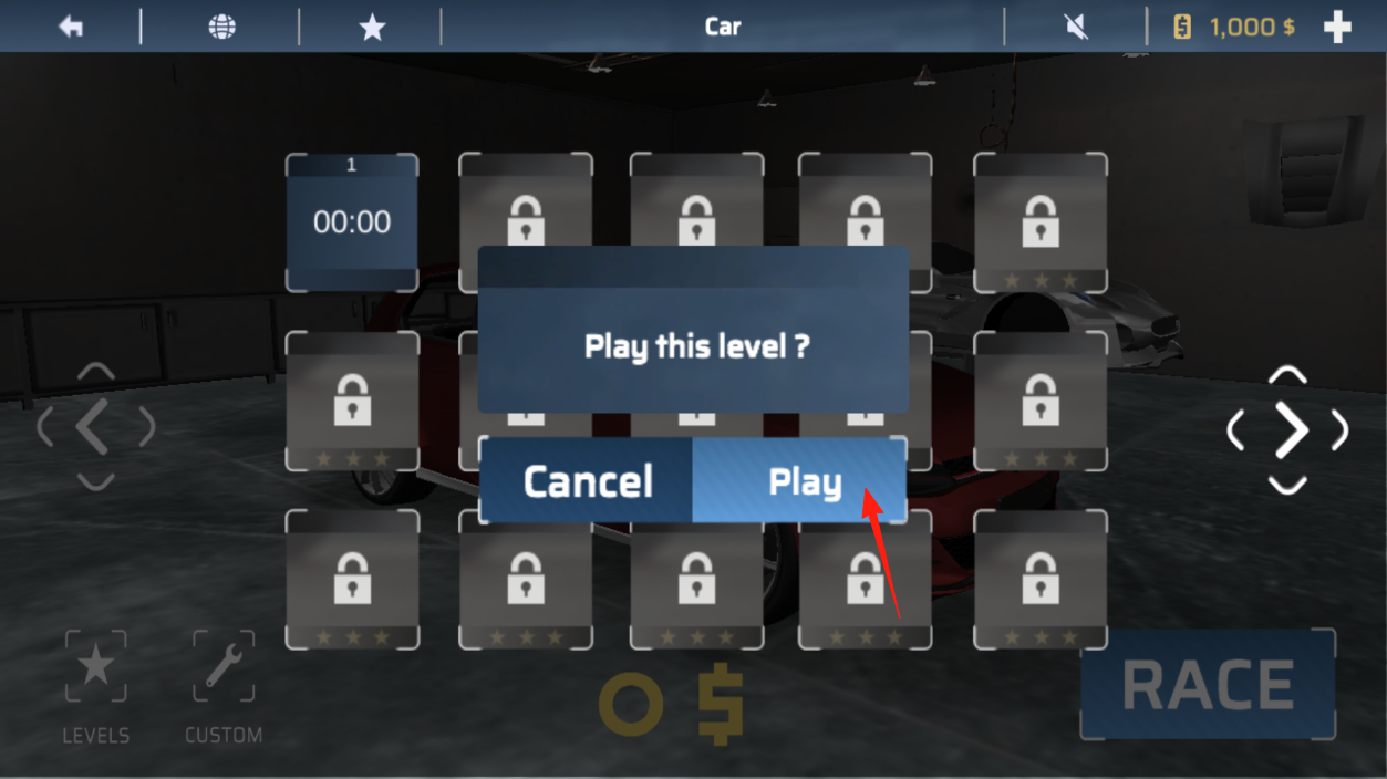 3、来到关卡选择界面,点击解锁关卡弹出确认框,选择Play,进入对应停车关卡,操控赛车完成停车挑战,逐步开启更多停车任务,通过确认进入。