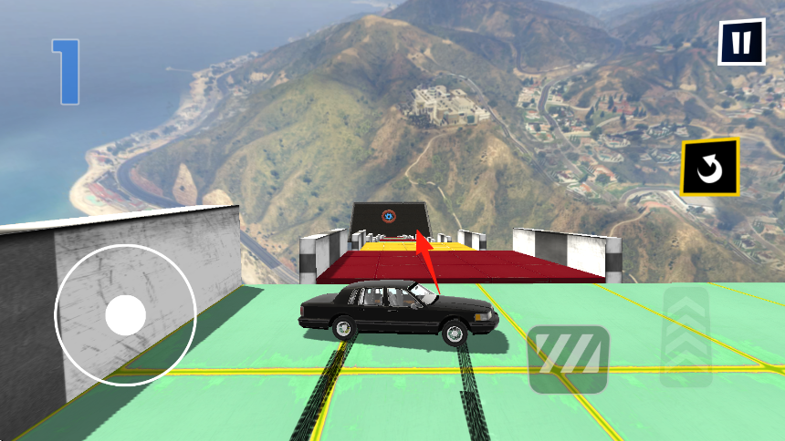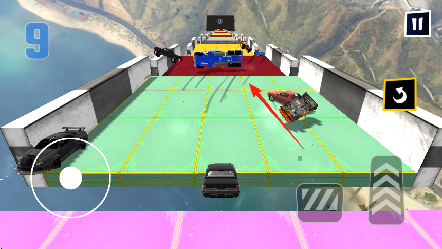 3、车飞出去后,盯着箭头指的平台,赶紧调车身,让车稳稳落在平台,完成这特技挑战,多练几次找感觉。