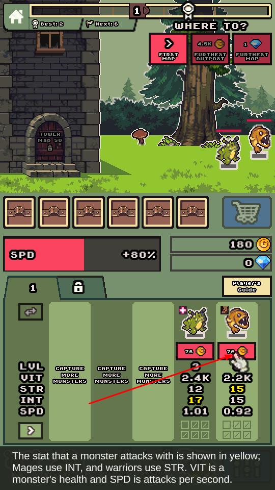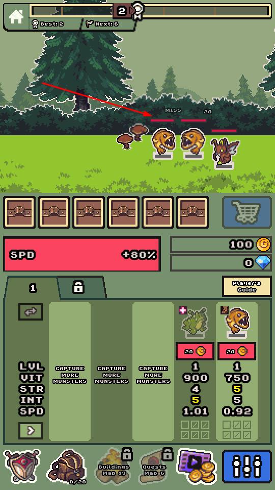 2、返回主界面培养怪物,提升等级与属性,解锁新地图,前往更远区域,挑战强敌扩充怪物军团。