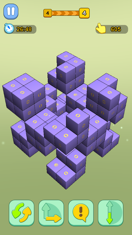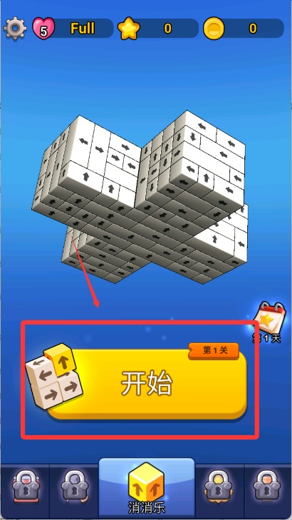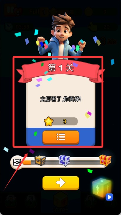 2、配合菱形箭头方块与直线箭头方块的消除,将场景内剩余方块合理引导至边缘,实现一步步清屏。