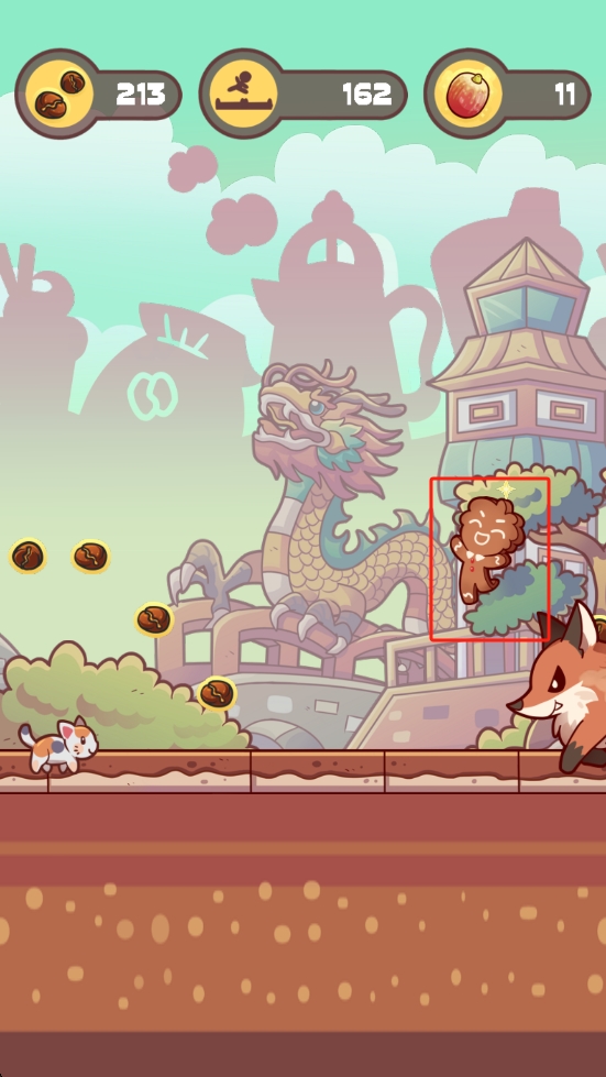 2、一段时间后会反着跑,持续控制姜饼人前进,收集空中与地面的咖啡豆,借助场景推进,警惕后方狐狸追击。