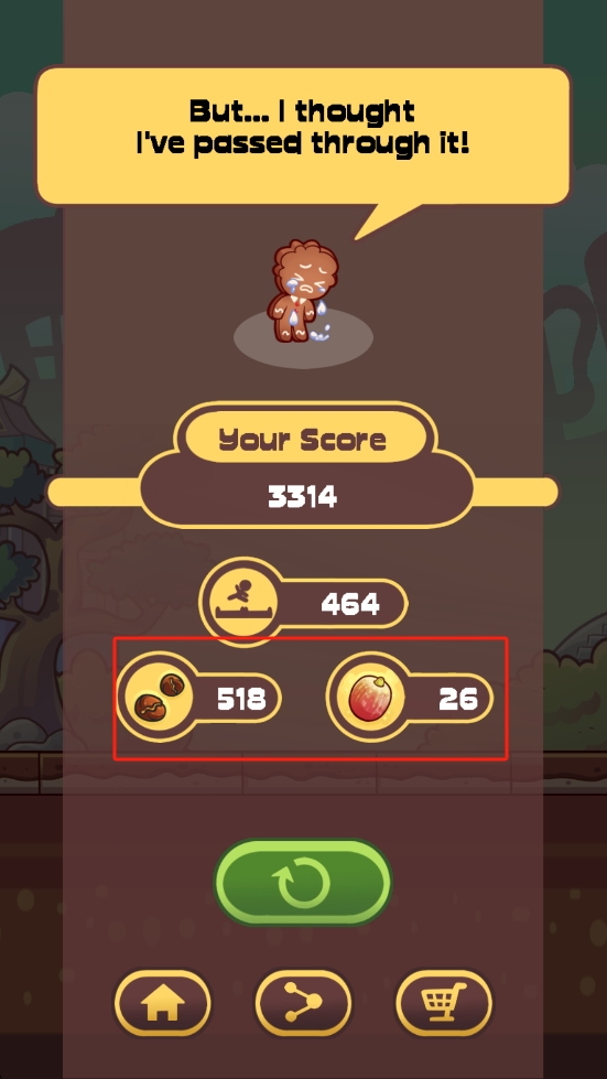 3、跑酷结束后,查看结算界面的咖啡豆与苹果数量,点击绿色重玩按钮可再次挑战,提升分数与收集量。