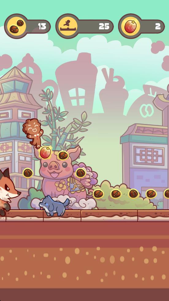 1、开局后我们操控姜饼人向右奔跑,收集沿途棕色咖啡豆,留意左侧狐狸,保持移动躲避危险,开启跑酷进程。