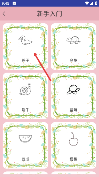2、进入新手入门页面,有鸭子、乌龟、蜗牛等多种图案卡,点击想绘制的图案,比如选鸭子,进入专属绘画场景。