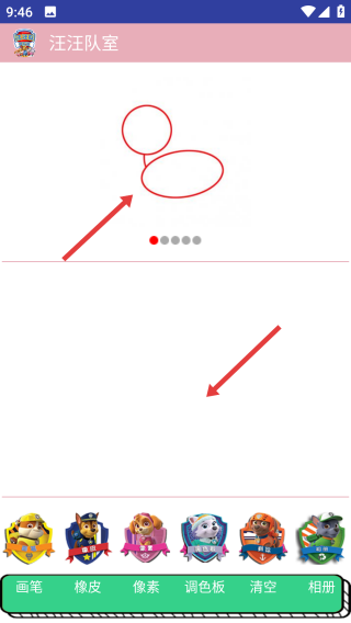 3、在绘画界面,比如汪汪队室,底部有画笔、橡皮、像素、调色板等工具。