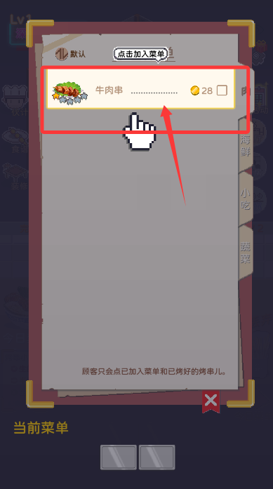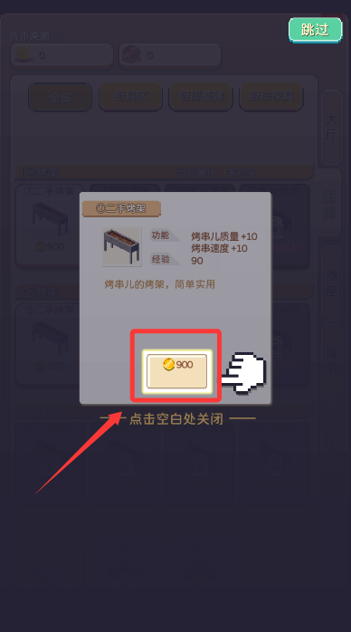 4、进入厨房升级页,花费金币购买烤架,提升烤串制作效率与容量。
