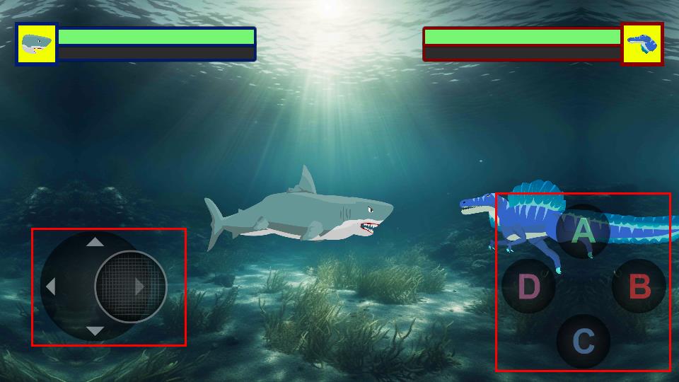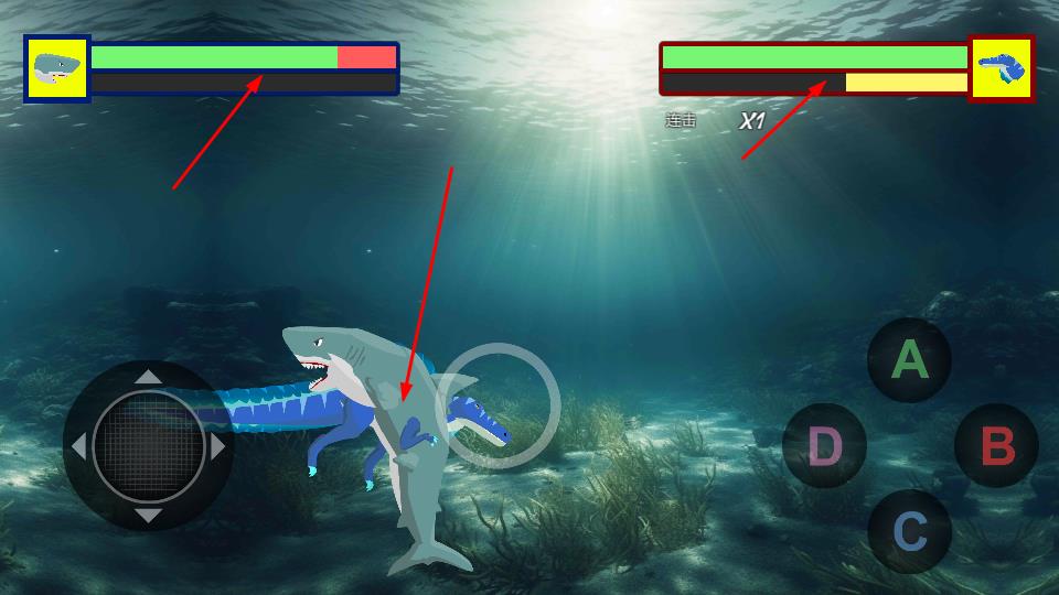 2、左侧方向轮盘控制移动,右侧A、B、C、D按键触发攻击,灵活操作躲避海怪进攻,找准时机反击。
