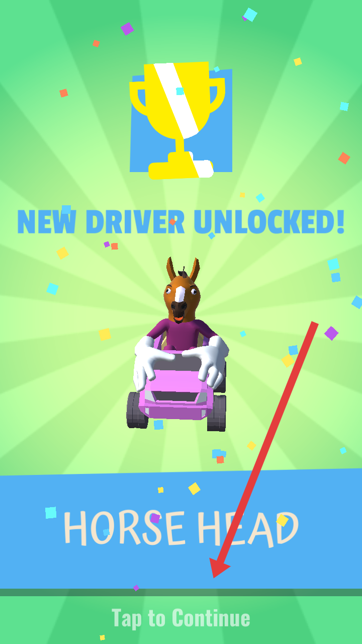 2、解锁新驾驶员HORSE HEAD后,需要点击Tap to Continue的按钮,即可继续下一关的游戏。