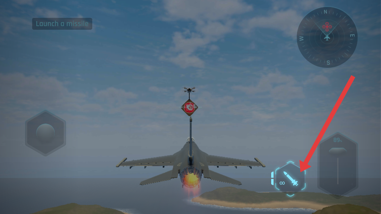 2、在飞行中需要按提示点击右侧导弹图标,发射导弹攻击指定目标,熟悉战机的武器使用。