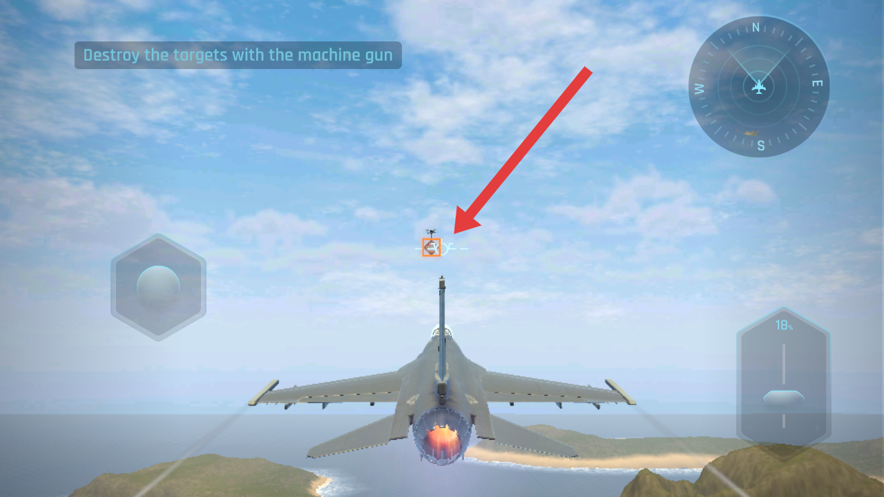 3、操控战机,利用机枪攻击空中目标,按提示Destroy the targets with the machine gun完成摧毁任务。