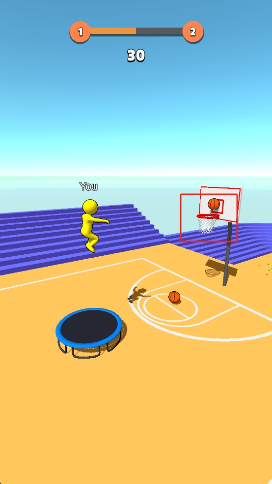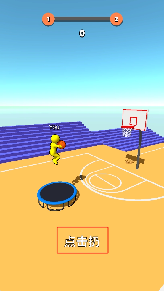 1、首先我们操控黄色角色站在蹦床上,看准时机点击屏幕下方的按钮,借助蹦床弹力将篮球投向篮筐。