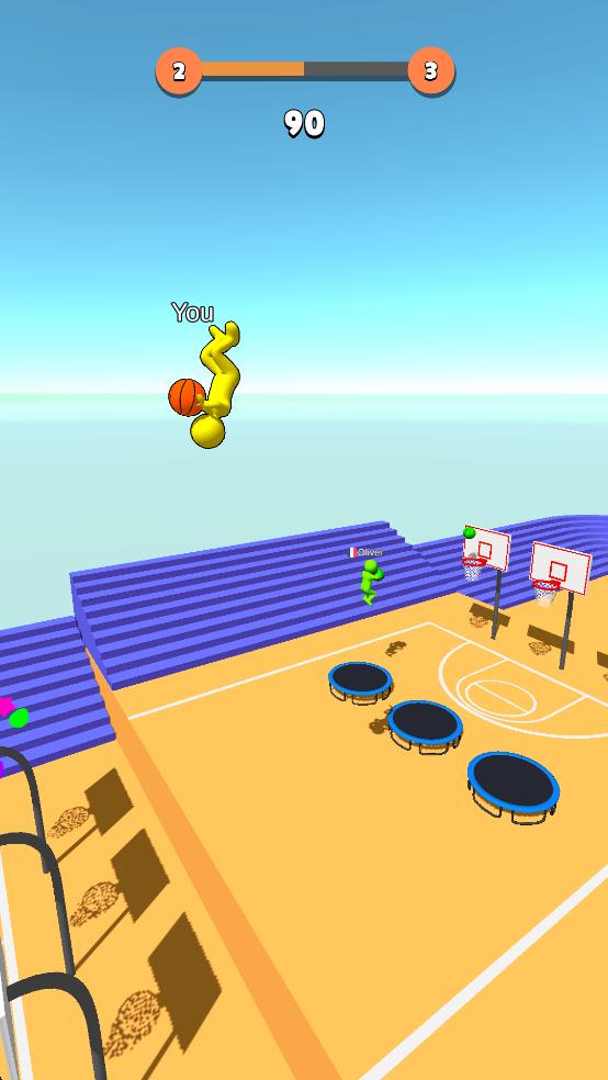 2、关卡中需观察篮筐位置与距离,滑动屏幕调整跳跃力度,松开手指让角色跃起,在空中调整姿态完成灌篮。