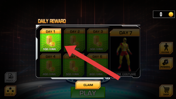 1、显示DAY1到DAY7的奖励,DAY7是免费服装,可根据提示提示先领取第一天的奖励,点击后方可进入场景。