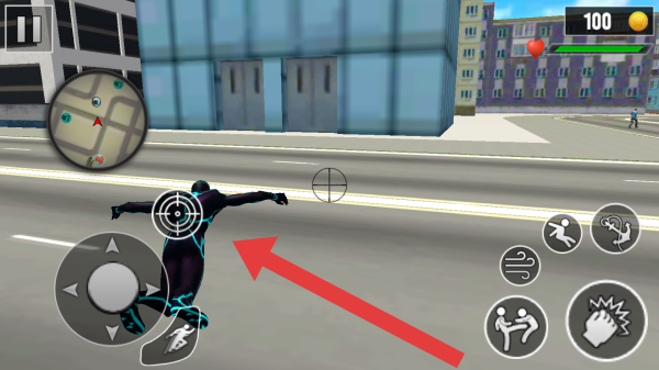 3、画面右侧的动作技能按键如跑步、攻击等图标,背景是城市街道场景,有建筑、道路等元素,呈现出玩家在城市环境行动的状态。