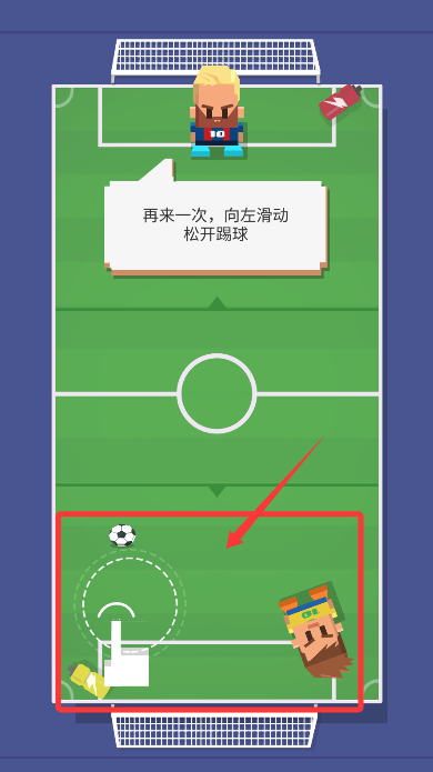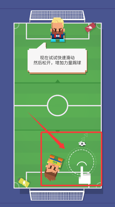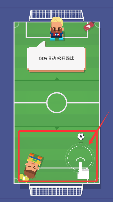 2、通过触屏滑动操控运动员移动,调整角度和力量进行射门。