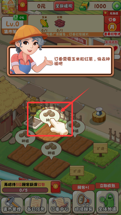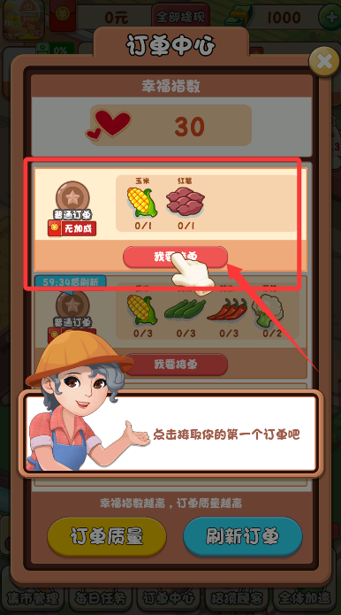 1、进入游戏后,筛选需要玉米红薯的订单,点击接取开启种植挑战。